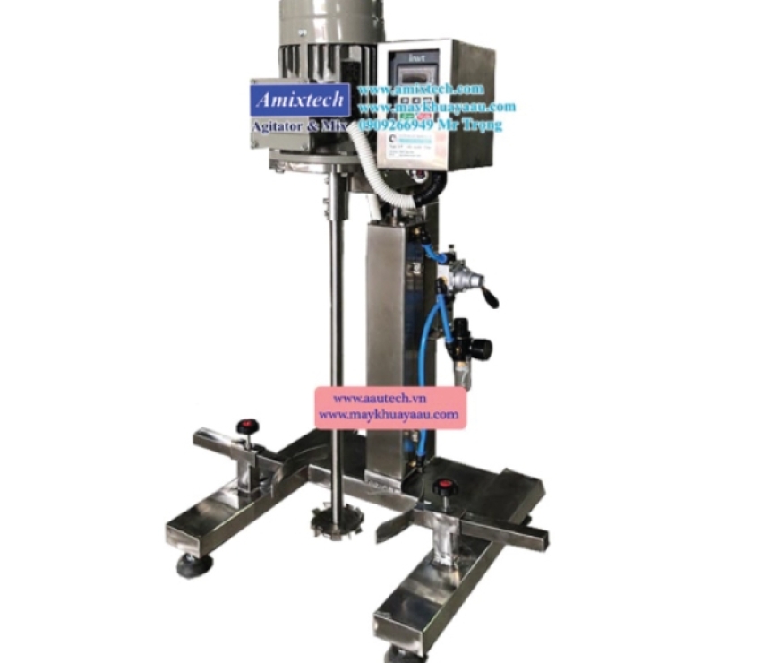 Điểm nổi bật của máy là cơ cấu ben khí nén giúp nâng hạ trục khuấy dễ dàng, tiết kiệm thời gian và công sức cho người vận hành khi thay thùng chứa. Trục và cánh khuấy làm bằng inox 304/316, chống gỉ sét, bền bỉ với hóa chất và an toàn với thực phẩm. Động cơ được thiết kế ổn định, truyền động trực tiếp đến trục khuấy, giúp khuấy nhanh và đồng đều dung dịch.